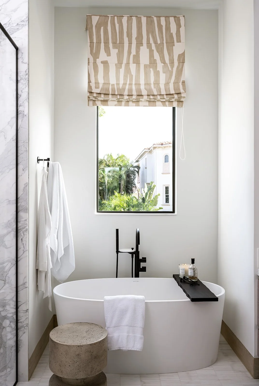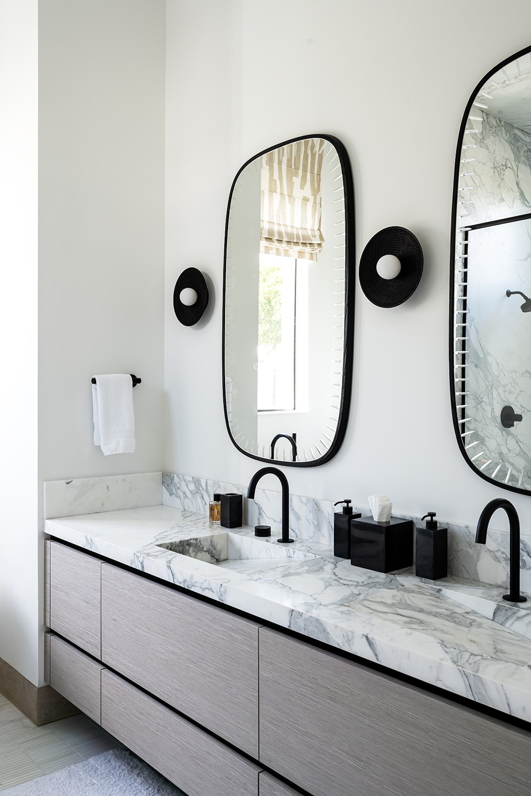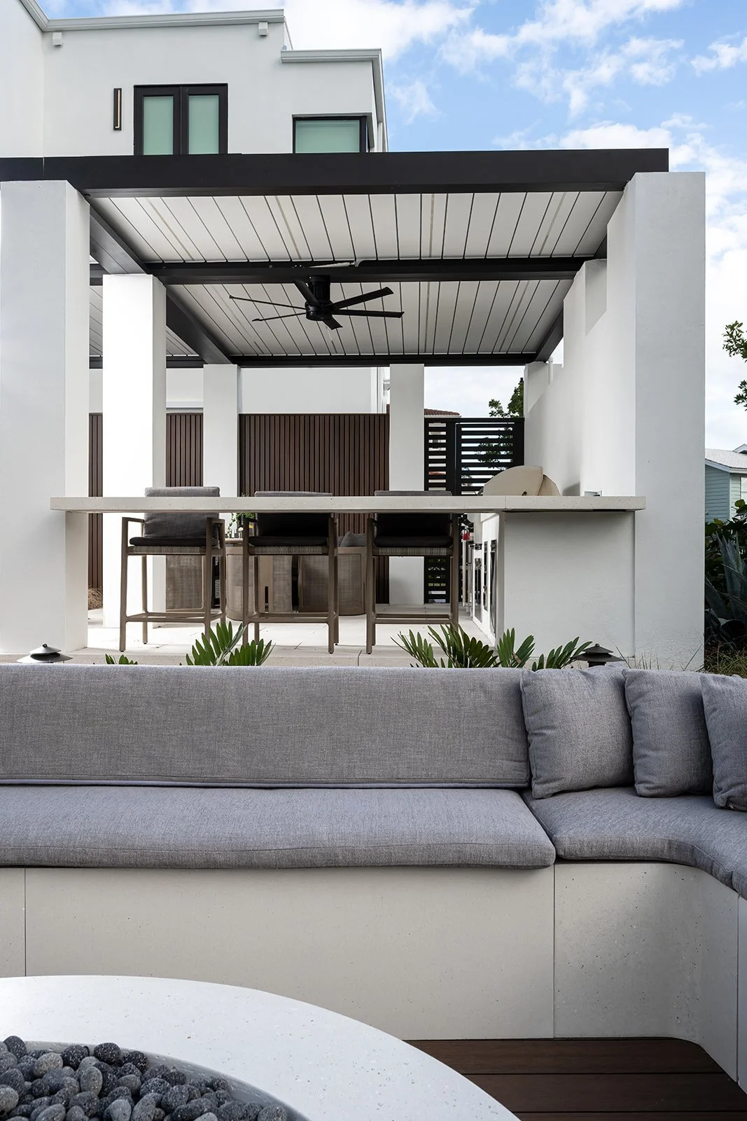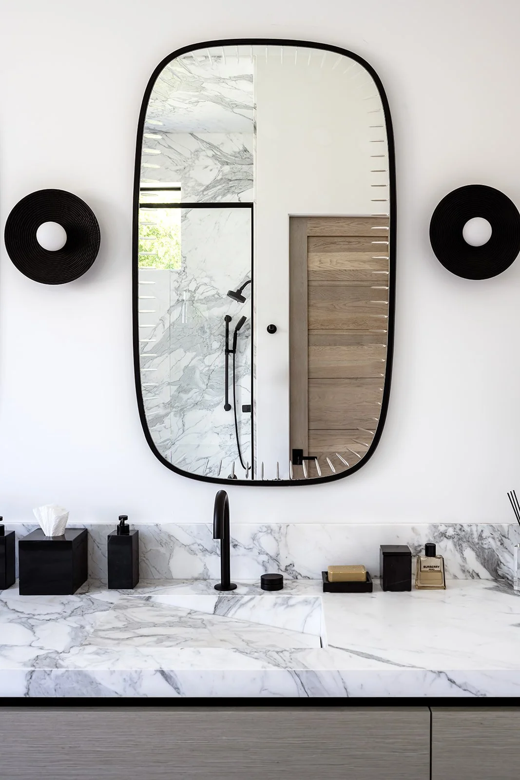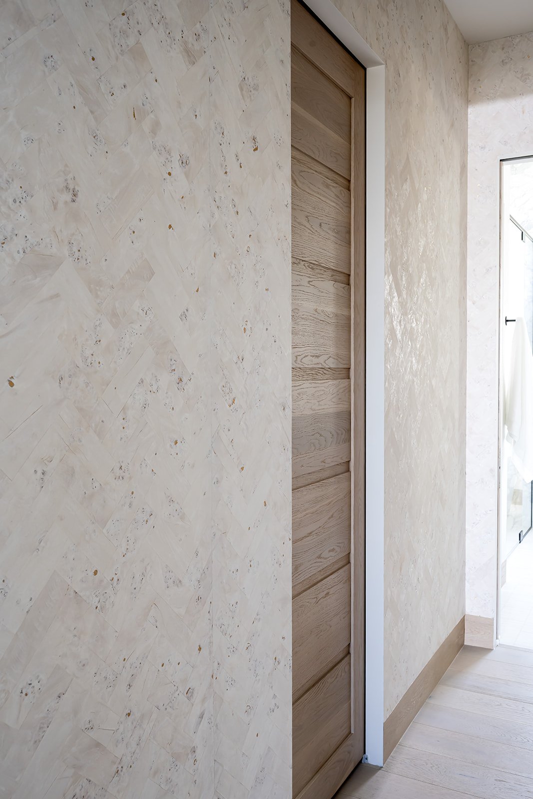 The exterior establishes a strong architectural presence, while the interiors carry that language inward through a palette of warm neutrals, organic materials, and tactile finishes. Soft curves balance clean lines. Intentional contrasts and quiet moments of pattern add dimension without overwhelming the serenity of the space.