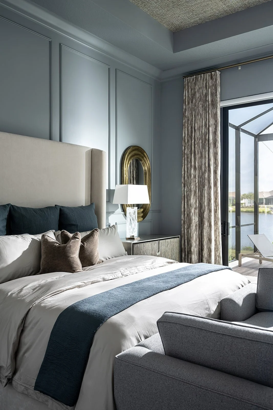 Our Rio Vista project embodies a collaborative vision, reflecting the synergy between our team and our client, whose design expertise from previous ventures has been instrumental. Together, we curated a refined aesthetic that harmoniously blends neutral elements with striking contrasts through the use of metals, intricate patterned wallpaper, and a sophisticated palette of blue monochromatic tones. The bespoke lighting design accentuates each space, beginning with the foyer, where the elegant brass dome sets a distinguished tone for the entire journey through the home. A particularly noteworthy element is the master bedroom, where we introduced an elevated design feature with a custom trim wall detail at the headboard wall. Layered with a soothing blue paint, this detail, which we passionately advocated for, has proven to be as fabulous as we envisioned, adding a touch of timeless elegance to the room. This home stands as a testament to the power of thoughtful collaboration and innovative design, culminating in a space that is both refined and deeply personal.